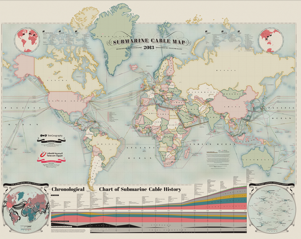 Firmaet TeleGeography har lavet et kort over kablerne. Kortet viser, hvordan kablerne forbinder verden og de mange lande.